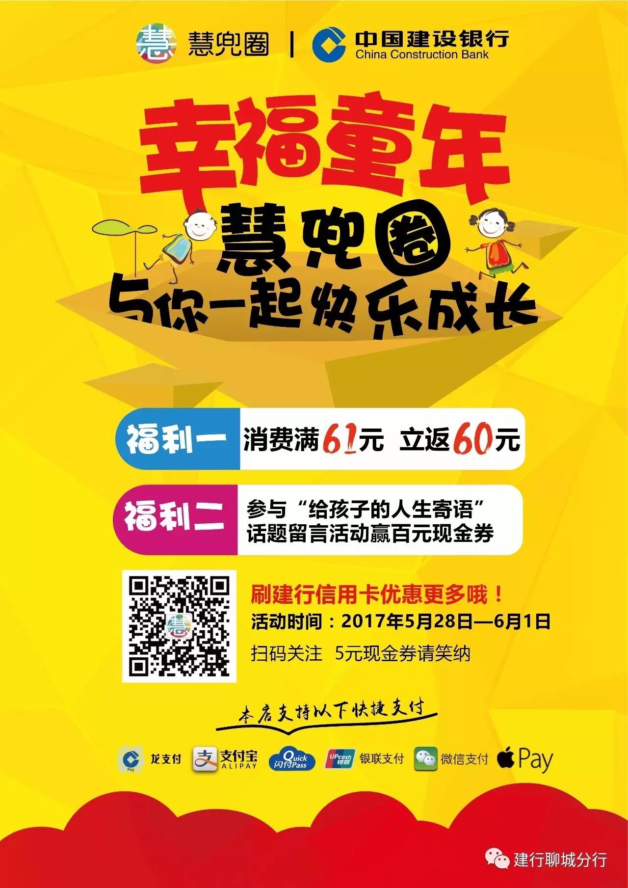 六一活动期间,刷建行卡更能获取更多优惠哦!详情关注“慧兜圈”微信公众号,知晓更多精彩活动内容。详询95533。