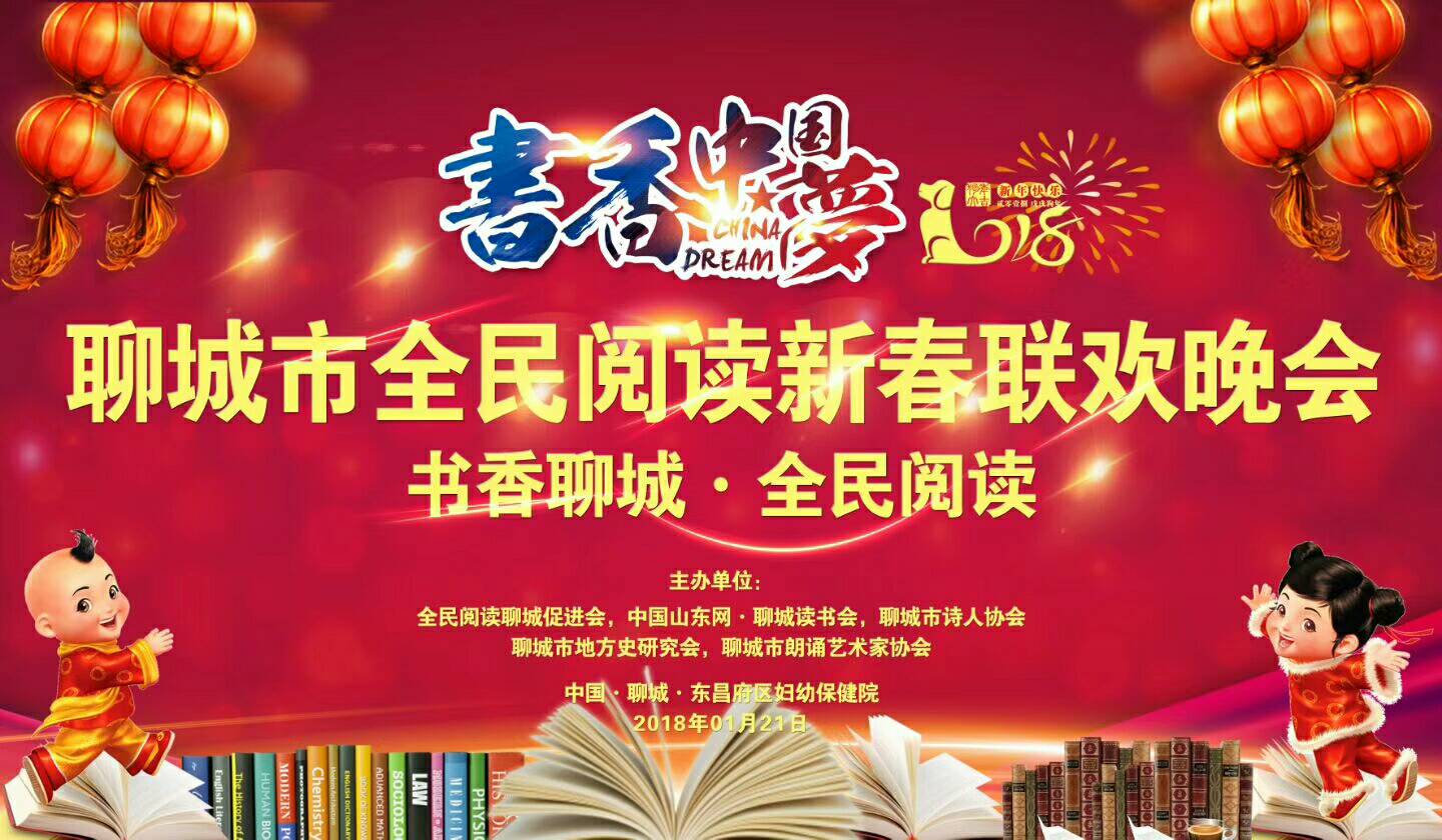 “书香中国梦”——2018聊城市首届全民阅读新春联欢晚会,由全民阅读聊城促进会、中国山东网聊城读书会、聊城市诗人协会、聊城市地方史研究会、聊城市朗诵艺术家协会联合主办。这是聊城市首次举办全民阅读文化主题春晚,既是首届书香聊城全民阅读系列活动阶段性总结提升的盛会,又是充分利用传统节日联结社会领域开展内容丰富、特色鲜明阅读活动的创新体验,迎接聊城全民阅读新年新气象,盛赞党的十九大胜利召开。