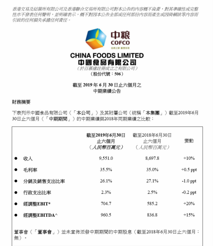 中国食品2019年中期业绩:营收95.51亿 净利润同比增长19.5%