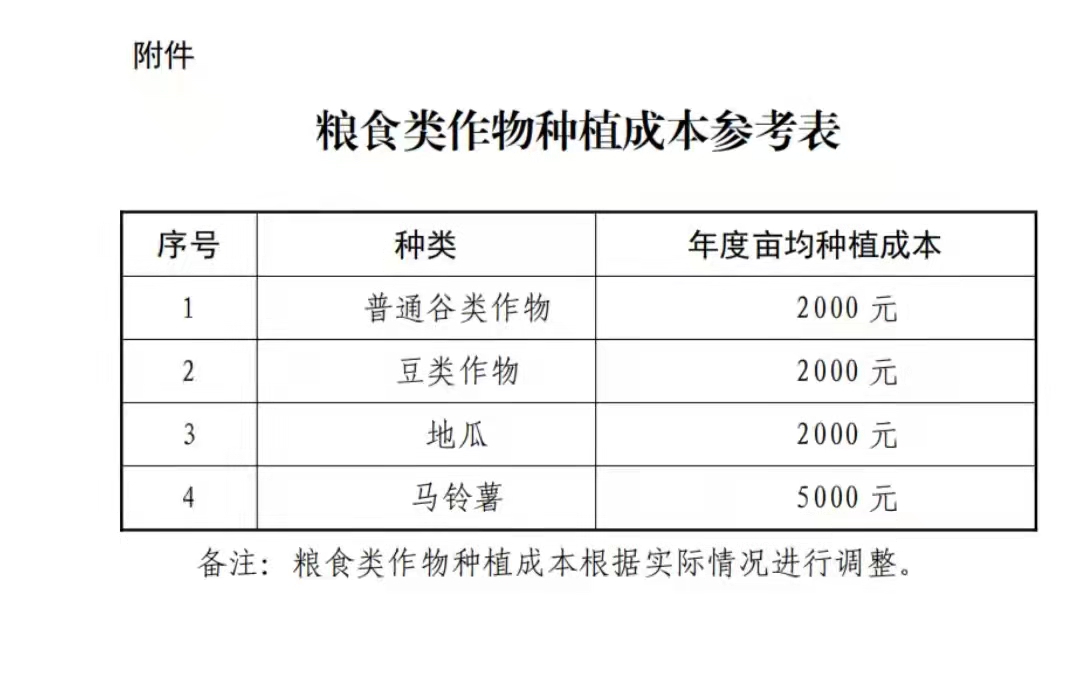 其中:普通粮食类作物亩均种植成本根据实际情况核定(见附表),优质品种种植成本可上浮 20%。