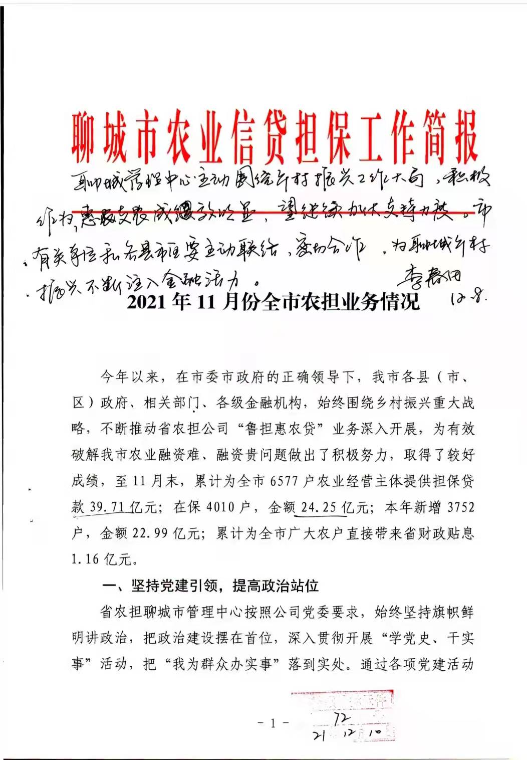 2021年12月8日,聊城市委副书记李春田在省农担公司聊城管理中心呈报的《2021年11月份全市农担业务情况》简报上作出批示:“聊城管理中心主动围绕乡村振兴工作大局,积极作为,惠农支农成效明显,望继续加大支持力度。市有关单位和各县市区要主动联络、密切合作,为聊城乡村振兴不断注入金融活力。”